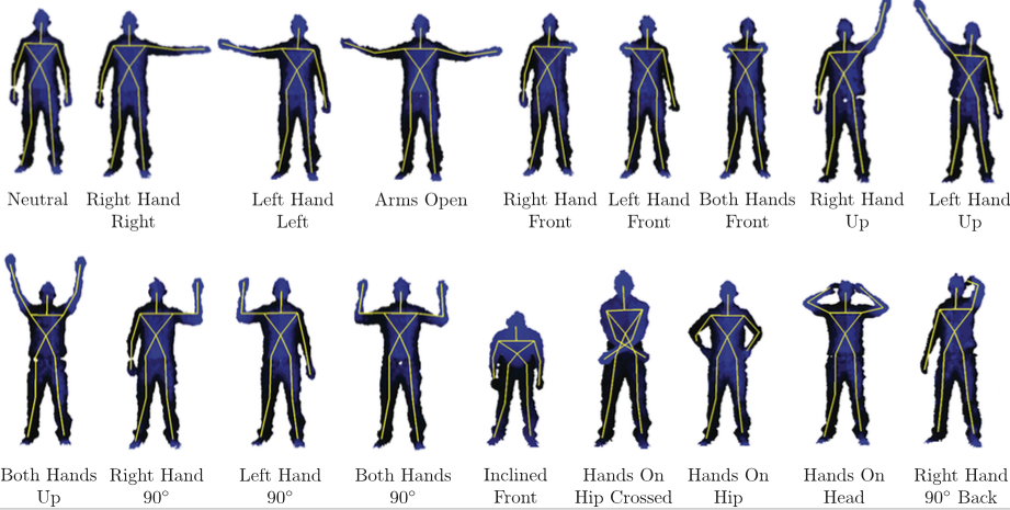 The keypose database is an ascii text file called "posedb.txt" with samples for the 18 keyposes described in the figure above. The names of each keypose can be found in the file "posenames.txt". Each line gives the description of the skeleton of a keypose sample in spherical coordinates of the body joints, and the keypose integer identifier, in the following order: